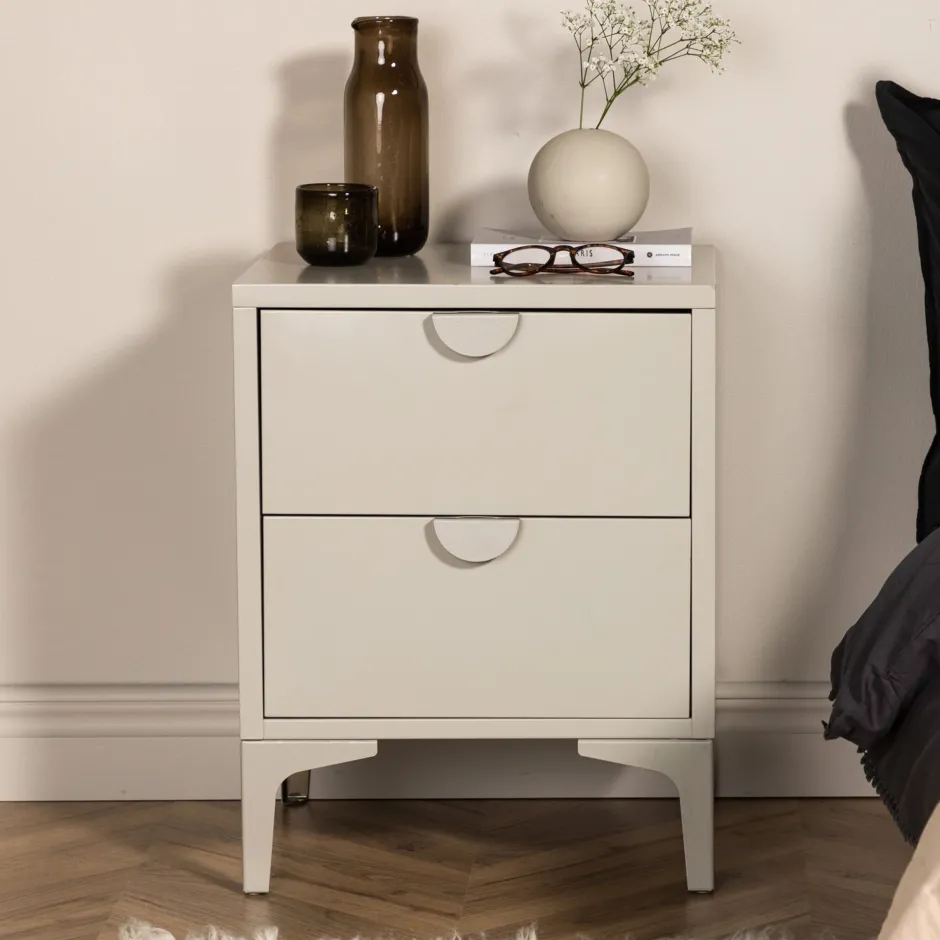 Het nachtkastje uit de Danyella serie is de perfecte opbergoplossing! Dit vierkante bijzettafeltje van beige staal heeft twee laden voor verborgen opbergruimte en een strak bovenblad met precies de juiste ruimte voor een bedlampje, een goed boek en misschien een decoratief accent voor een moderne look. De tafel wordt opgetild door vier poten, waardoor hij licht en luchtig aanvoelt, terwijl de strakke lijnen ervoor zorgen dat hij gemakkelijk te plaatsen en te combineren is met andere interieurstijlen. Bekijk onze afbeeldingen voor inspiratie!