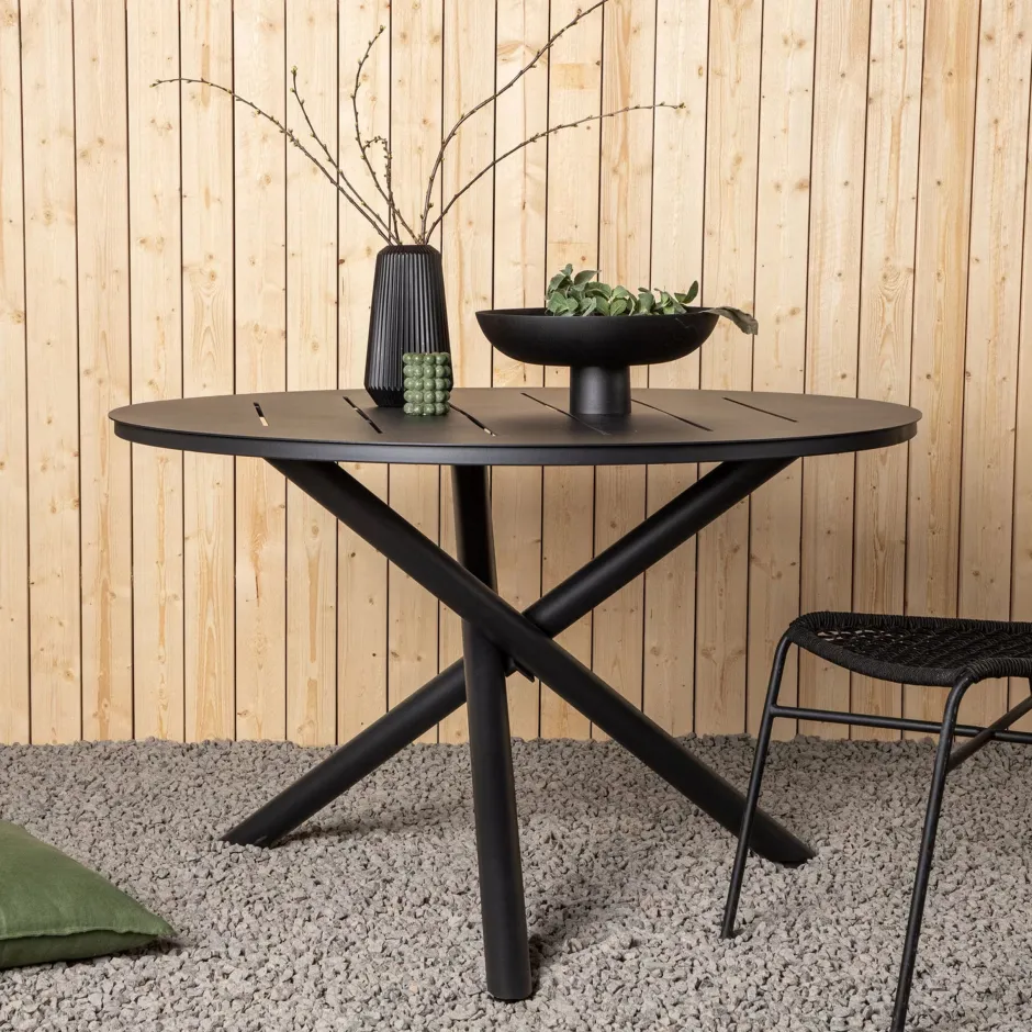 Markeshia – een ronde eettafel in een stijlvol ontwerp dat in de meeste omgevingen past. De tafel is gemaakt van zwart aluminium, een robuust materiaal dat tegen een stootje kan. Creëer een charmant middenstuk waar niemand op de rand belandt en geniet van heerlijke momenten met familie en vrienden!