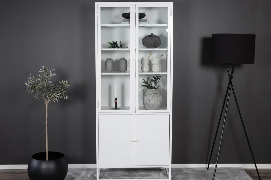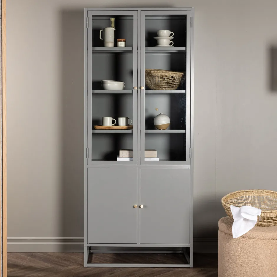 Onze populaire kast in modern industrieel ontwerp is gemaakt van gepoedercoat lichtgrijs staal en gaat lang mee! De kast biedt zowel verborgen als open opbergruimte en past perfect in de moderne woonkamer. De bovenkant heeft twee hoge glazen deuren met een frame van gepoedercoat lichtgrijs staal en vier reliëfvlakken voor open opbergruimte. De rok heeft twee onderste deuren met verborgen opbergruimte in gepoedercoat lichtgrijs staal en twee reliëfvlakken. Alle deuren hebben messingkleurige knoppen, wat een leuk detail zal zijn. De hele kast rust op een open frame van lichtgrijs gepoedercoat staal dat een luchtig gevoel geeft en ook de stofzuiger vergemakkelijkt. Richt je huis stijlvol en slim in!