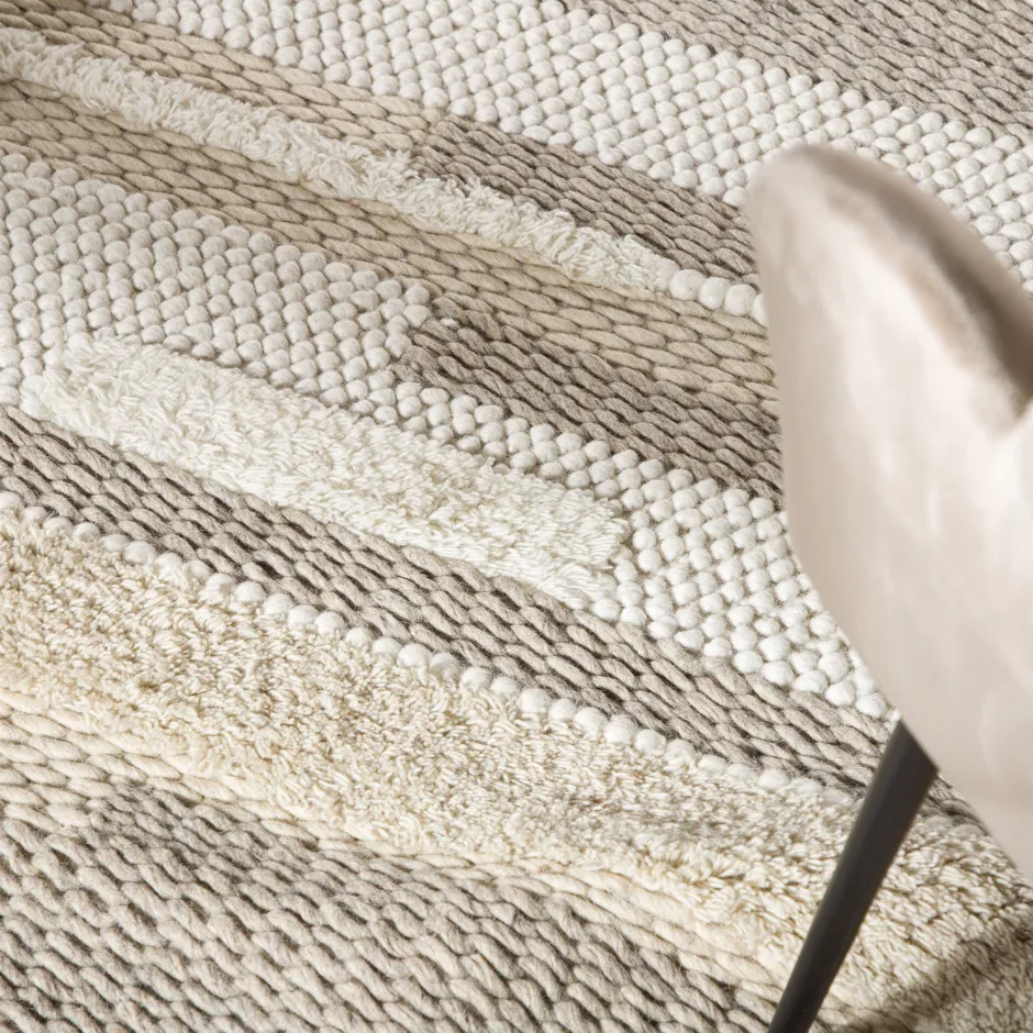 Het zachte materiaal voelt comfortabel aan onder de voeten en nodigt uit tot ontspannen. Dankzij de organische kleuren en het rijke textuurspel past Elesha in een warme, natuurlijke of Scandinavisch geïnspireerde inrichting, waar het direct karakter en sfeer toevoegt aan de ruimte.