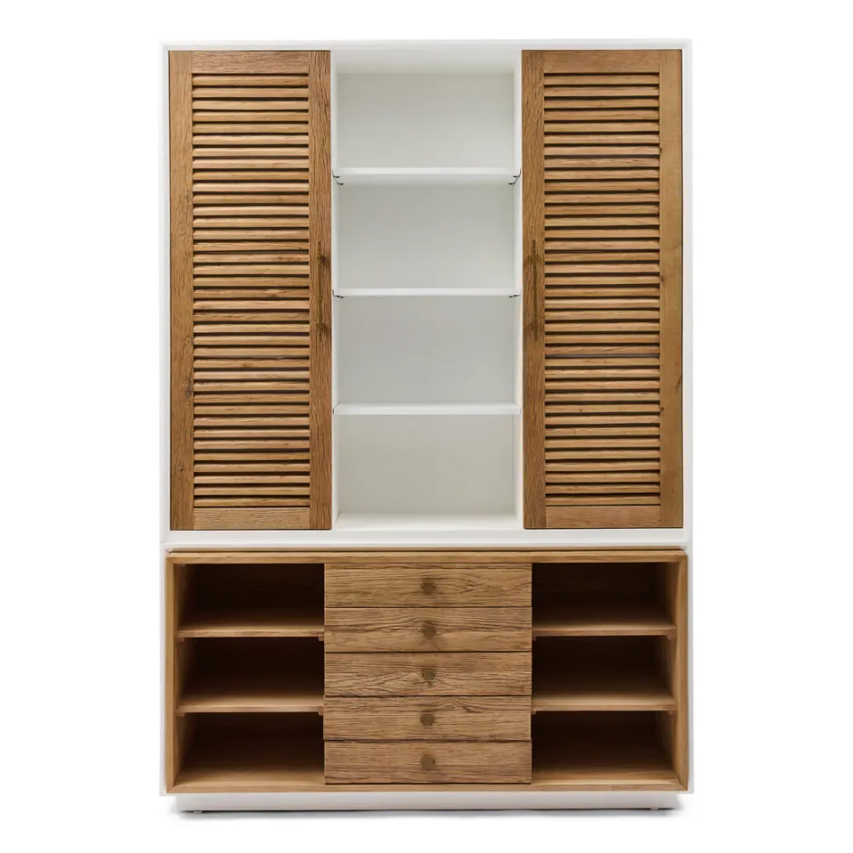 De Lake House buffetkast is de perfecte manier om je interieur te verrijken met tijdloze charme en luxe. Deze prachtige kast, met een witte basis en houten shutterdeuren, biedt niet alleen veel opbergruimte, maar ook een elegante uitstraling die past bij verschillende interieurstijlen. Het meubel heeft een indrukwekkende hoogte van 230 cm, een breedte van 156 cm en een diepte van 42 cm, met zeven handige lades en meerdere vakken voor een geordende en sfeervolle opbergruimte. De combinatie van het lichte ontwerp en de warme houten accenten creëert een landelijke sfeer die je huis meteen uitnodigend maakt. De Lake House buffetkast voegt karakter toe aan elke ruimte, en de eenvoudige afwerking maakt het onderhoud een fluitje van een cent.