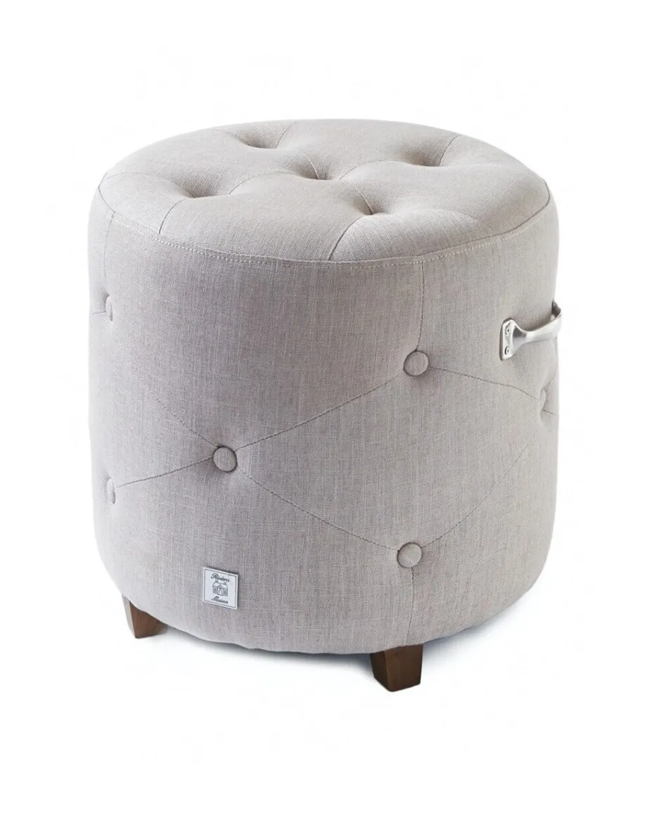 Gecapitonneerde voetstoel van linnen. Verkrijgbaar in meerdere kleuren.