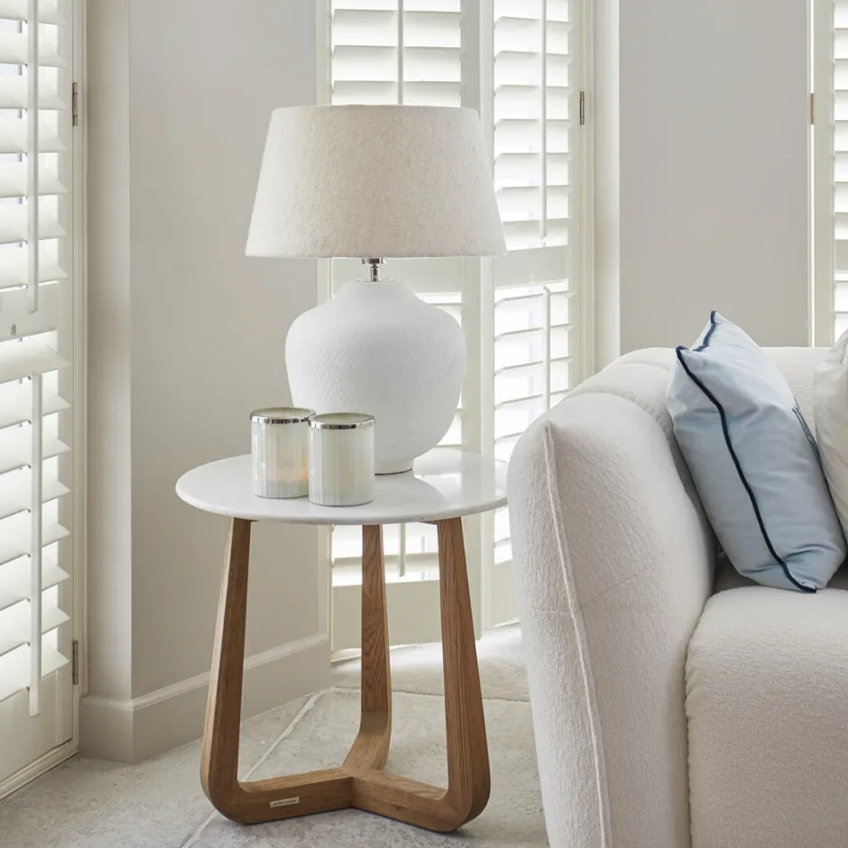 - Deze bijzettafel is werkelijk uniek. Het ronde marmeren blad voegt een luxe uitstraling toe, terwijl de drie eikenhouten poten in een modern ontwerp samenkomen. Het subtiele Rivièra Maison-logo op de poot accentueert de verfijning van het geheel. Elke tafel is uniek door de natuursteen, waardoor je altijd een one-of-a-kind stuk in je interieur hebt. Perfect voor een stijlvolle en eigentijdse touch.