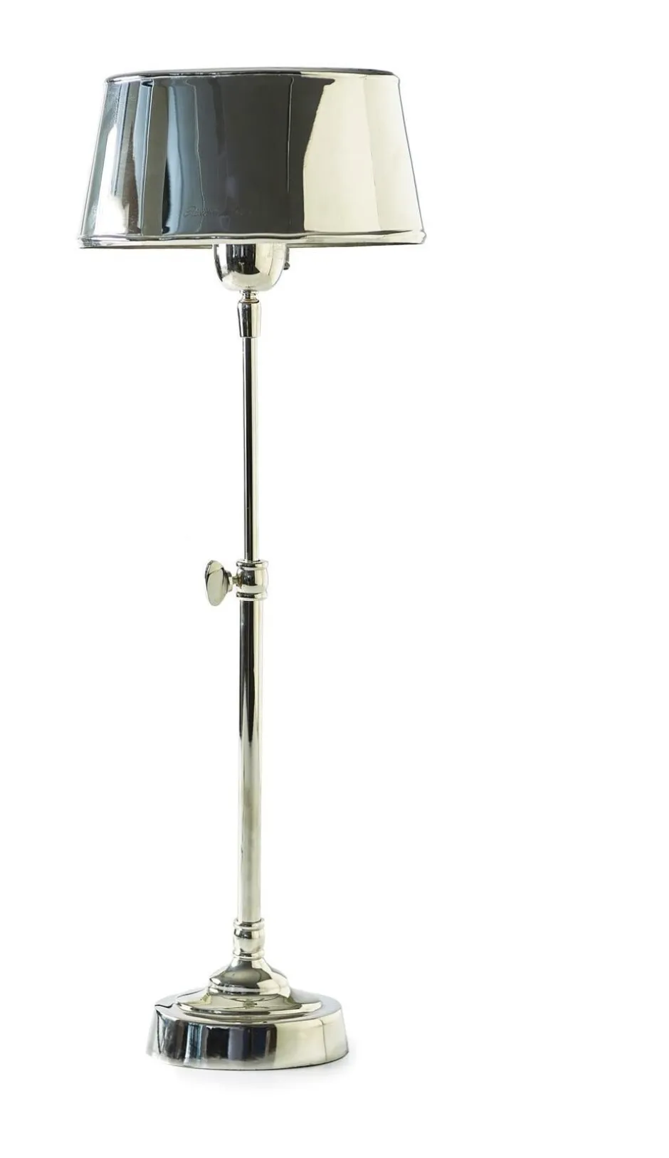 Aluminium tafellamp met een ovalen kapje waarin de naam Rivièra Maison staat gegraveerd.Artikelnummer:RM-985100Levertij…