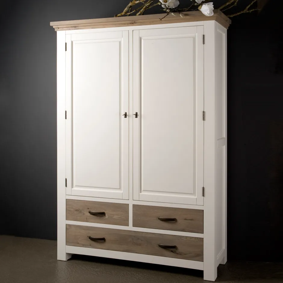 De opbergkast is gemaakt van rustiek eiken en grenen. De eiken delen worden licht geborsteld en afgewerkt met een olie. Het witte grenen frame van de meubelen wordt op enkele plaatsen lichtelijk opgeschuurd.