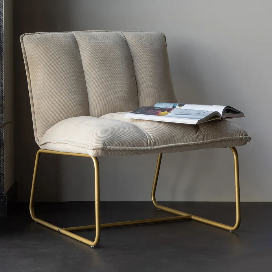 Het onderstel is gemaakt van goudgekleurd metaal, wat de fauteuil een luxe uiterlijk geeft. Het zitgedeelte is gestoffeerd met een zandkleurige ribstof van 100% polyester. Het zit- en rugkussen hebben een PU-foam vulling.