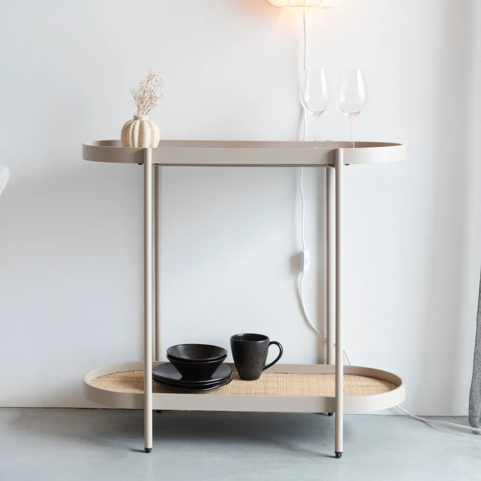 | Materiaal: | MDF-hout gelakt en rattan, ijzeren poten met poedercoating |