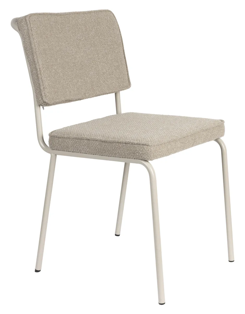 De Buddy stoel is gemaakt met het oog op comfort en heeft een lichtgewicht frame met zachte bekleding van boucléstof. De bekleding is gemaakt van 100% gerecycled materiaal. Het frame van de stoel loopt naadloos over in de greep aan de achterkant. Dit ergonomische detail zorgt voor gemakkelijk verplaatsen en voegt een vleugje verfijning toe.