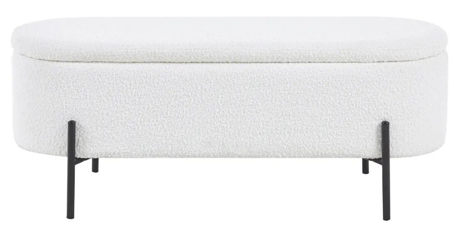 Als je op zoek bent naar Scandinavisch design met praktische voordelen, dan is deze bedbank met trendy bouclé bekleding de juiste keuze. De gestoffeerde kruk scoort niet alleen met zijn vooruitstrevende design, maar biedt ook een slimme opbergfunctie achter het opklapbare deksel. Of het nu gaat om dekens, dekbedovertrekken of kleding – je kunt stijlvol orde scheppen in de bedbank en rondslingerende spullen opbergen. De bouclé stof, die allang zijn weg heeft gevonden naar onze woon- en slaapkamers, straalt warmte en geborgenheid uit. Bovendien weerspiegelt de stof met zijn wollige look vakkundig de essentie van de populaire Scandi-stijl. Het designframe met hoge poten is gemaakt van gepoedercoat zwart metaal en maakt de look helemaal af.