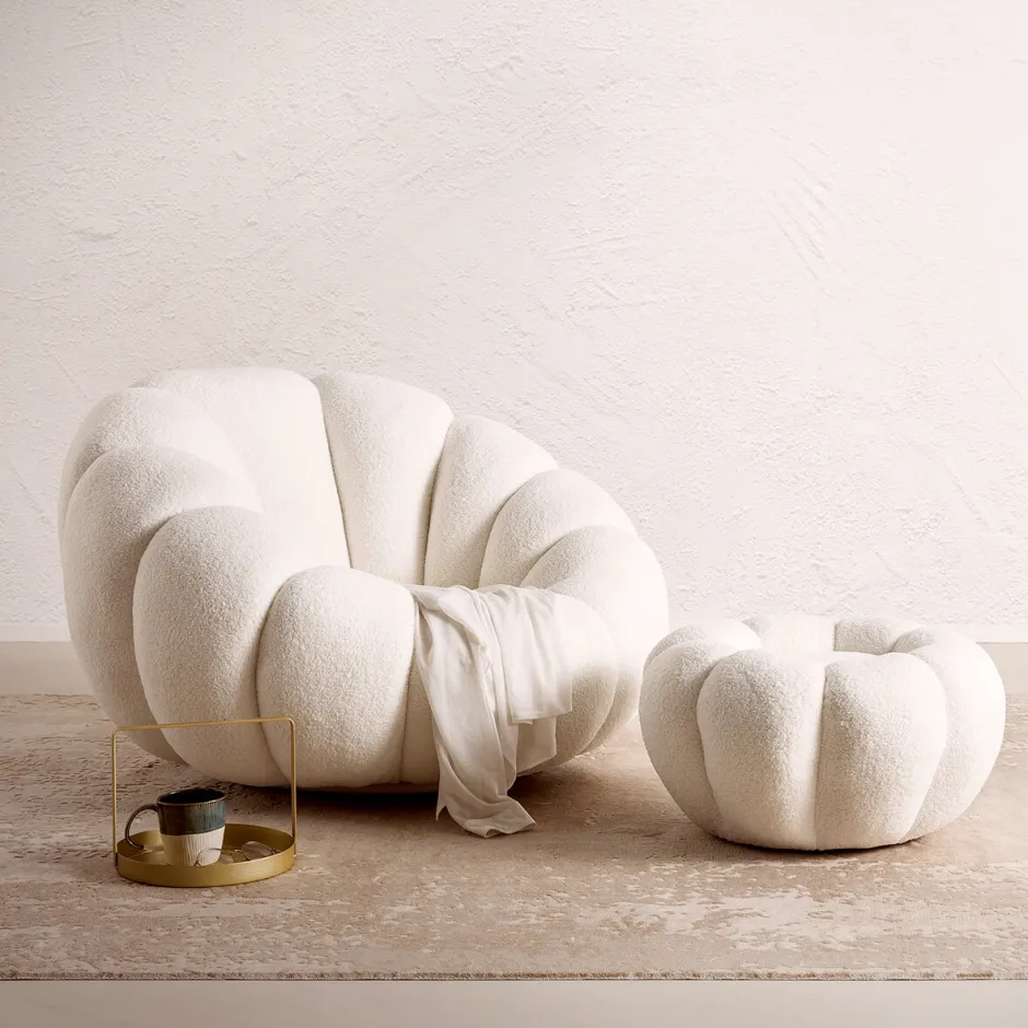 - Zachte loungestoel in een originele vorm met bijpassend krukje