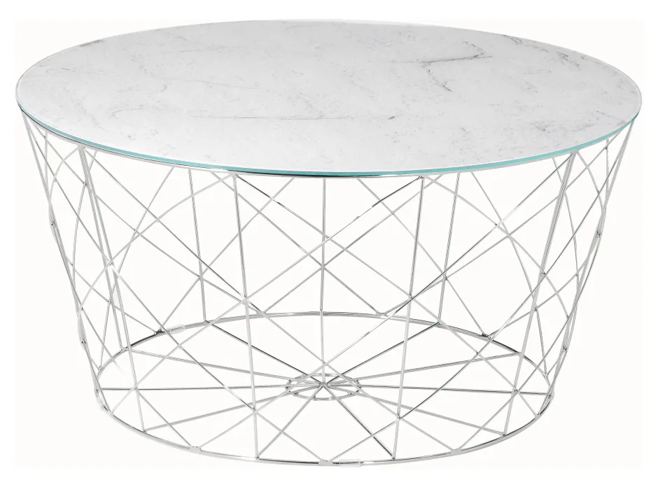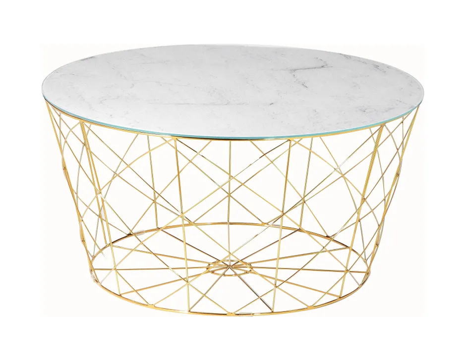 De ronde salontafel combineert modern design met een dosis extravagantie. Het glazen blad met onderliggende folie in marmerlook past perfect bij het metalen frame in goud. De banktafel biedt voldoende opbergruimte voor bijvoorbeeld fruit, knabbels of een bloemenvaas. Het frame kan gebruikt worden als opbergmand voor tijdschriften. Dankzij het aantrekkelijke ontwerp is deze salontafel met veel meubels te combineren en zal hij ook in jouw huis een passende plaats vinden.