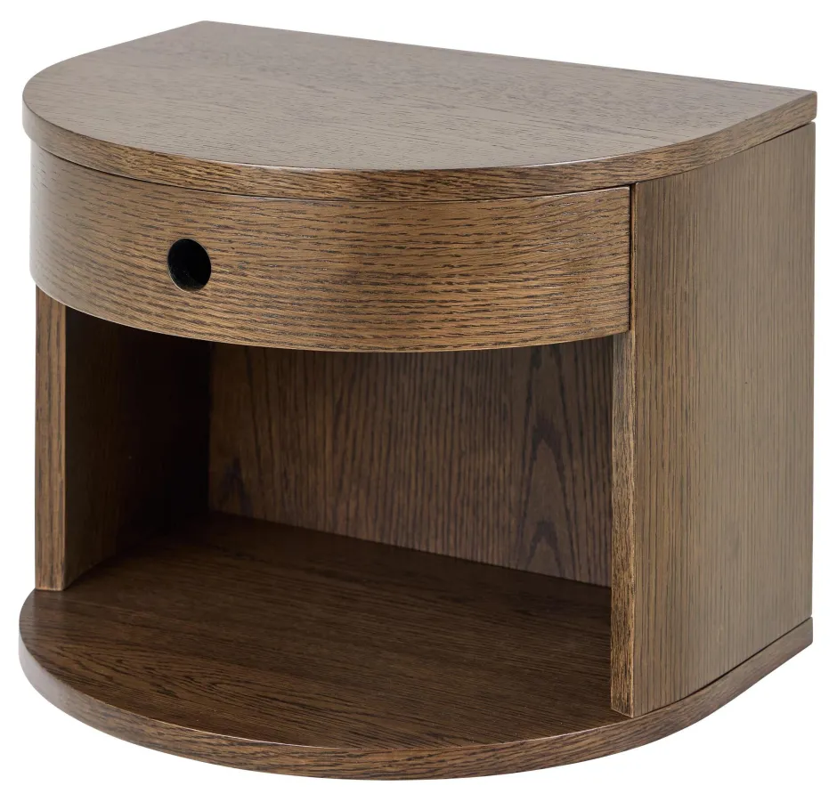 Dit nachtkastje voor aan de muur valt op door zijn halfronde vorm. Het is voorzien van een lade en een open vak voor kleine benodigdheden. Het gelakte eikenfineer accentueert het ontwerp van het tafeltje en benadrukt de natuurlijke uitstraling.