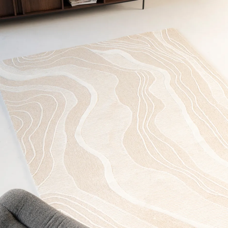 Het wollen vloerkleed Soil van By-Boo is rechthoekig met organische patronen die speels over het kleed lopen. Verschillende tinten beige creëren diepte en warmte, terwijl het subtiele lijnenspel het geheel levendig en interessant maakt.