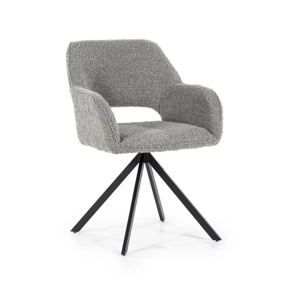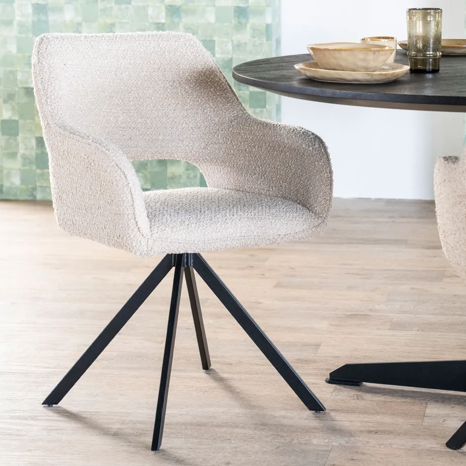 Soms zie je een eetkamerstoel die je meteen in je eethoek ziet staan. Eetkamerstoel ‘Fabio’ is zeker zo’n exemplaar. Deze draaibare beauty is bekleed met een zachte bouclé stof. De stof zorgt voor een trendy look in je interieur. De kuipzitting is zo gevormd dat je wel een hele dag op de stoel wil blijven zitten. De opening bij de rugleuning vormt een opvallend detail en maakt van eetkamerstoel ‘Fabio’ een plaatje om te zien.