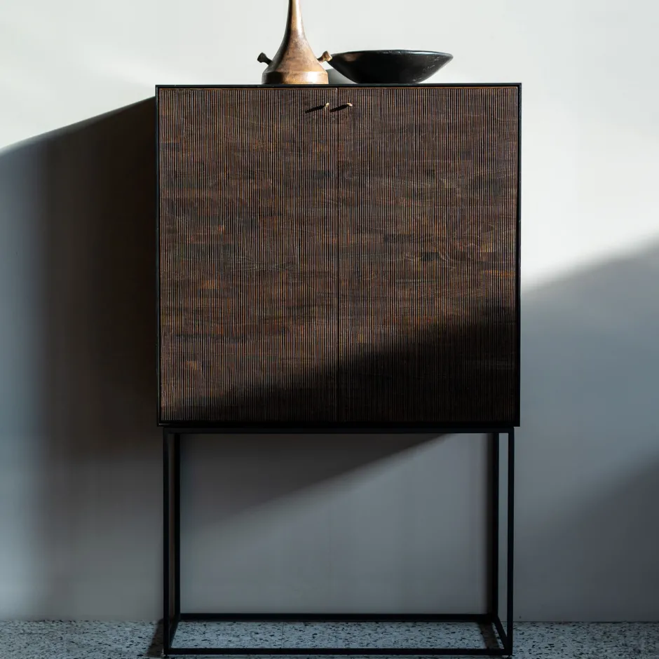 De Grooves opbergkast uit massief teakhout zit vol ritme en dynamiek. Elke lijn is met de hand gesneden, waardoor ieder stuk werkelijk uniek is. Kleine imperfecties zijn deel van het verhaal, sterker nog: ze geven Grooves nog meer karakter. Het resultaat is elke keer een lichtjes anders oppervlak, elk met zijn eigen ritme en dynamiek. Het prachtige donkergetinte teak zit ook aan de binnenkant, waar planken en lades voor een veilige opbergruimte zorgen.