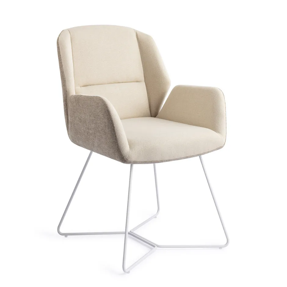 De zitting van de Myoko heeft een mooi verdeelde schuimlaag die niet te hard en niet te zacht is. Stevige armleuningen en de rechte rugleuning zorgen voor een juiste zithouding met voldoende steun. De zitting is bekleed met twee verschillende stoffen in verschillende kleuren wat zorgt voor een speels contrast en tegelijkertijd eenheid door de neutrale kleuren.