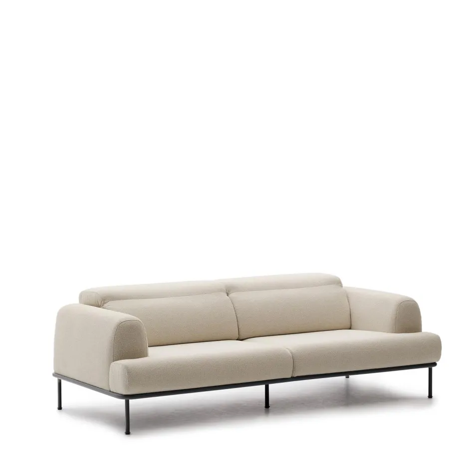- 3-zitsbank bekleed met ecru chenille met fijne structuur dat zacht aanvoelt. Metalen basis met matte microstructuur.