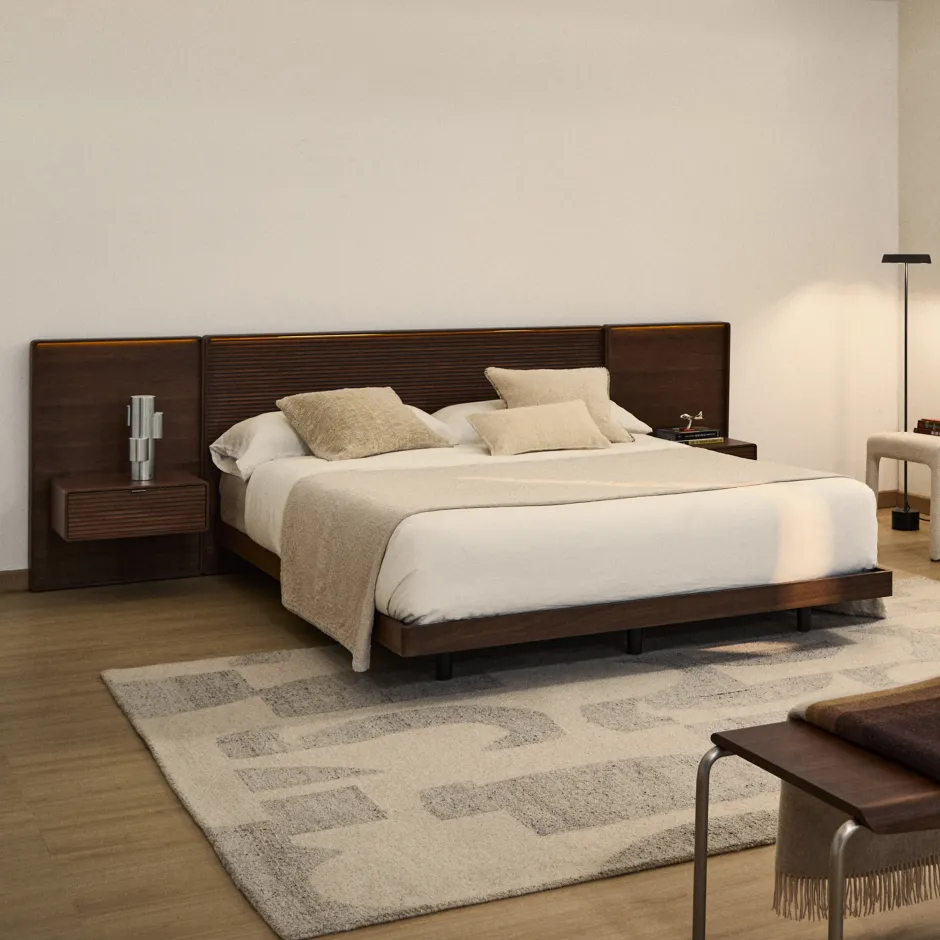 - Bed met hoofdbord en twee nachtkastjes in walnootfineer met horizontale lineaire frees en LED-lichtstrip aan de bovenkant.