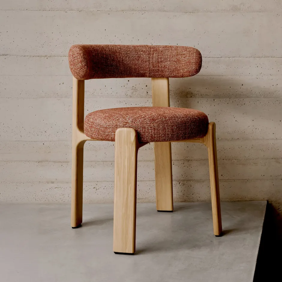 - Stoel bekleed in chenille met gerecycled polyester met een grove structuur in tweekleurig beige.