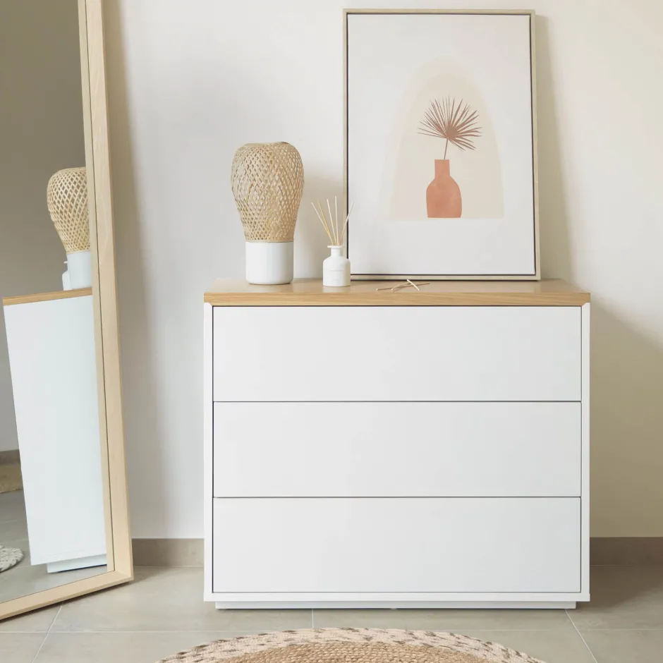 Geen ruimte meer in je garderobe? Dan is een ladekast de ideale oplossing. Naast voldoende opbergruimte in de drie wit gelakte lades, heb je ook ruimte voor een leuke spiegel en extra spulletjes op het eikenhouten fineerblad.