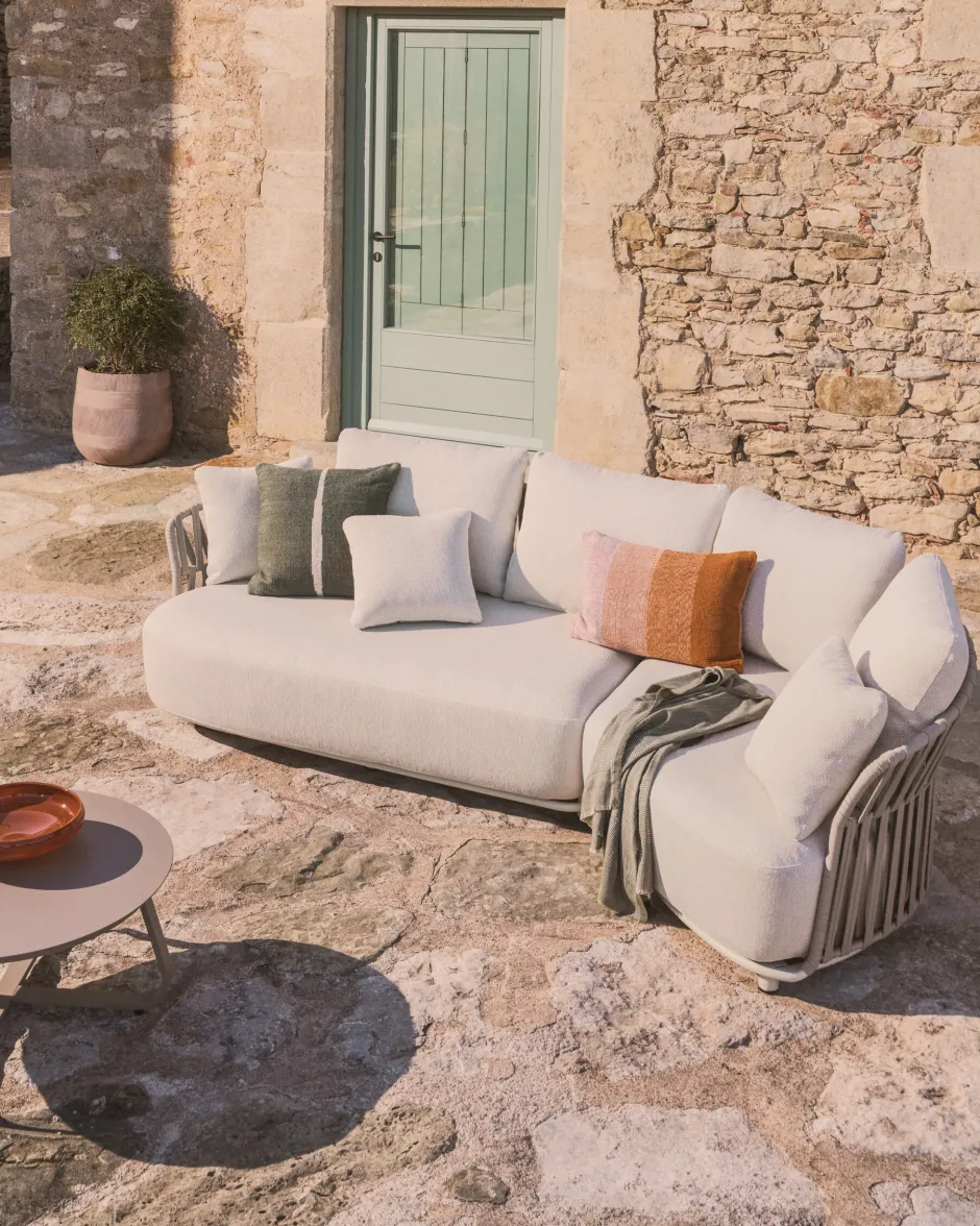 De Osani-collectie is ontworpen voor binnen- en buitenruimtes en heeft een serene uitstraling. De aluminium structuur is lichtgewicht en bestand tegen oxidatie, corrosie en UV-straling, geschikt voor continu gebruik in de buitenlucht. De rugleuning van handgevlochten touw bepaalt het karakter van het meubel en biedt comfortabele ondersteuning, en hij blijft in goede staat bij blootstelling aan de zon. De kussens hebben afneembare hoezen voor eenvoudig onderhoud. We raden aan om de kussens op regenachtige dagen op te bergen. Bovendien heeft hij kunststof bescherming onder de poten om de vloer te beschermen.