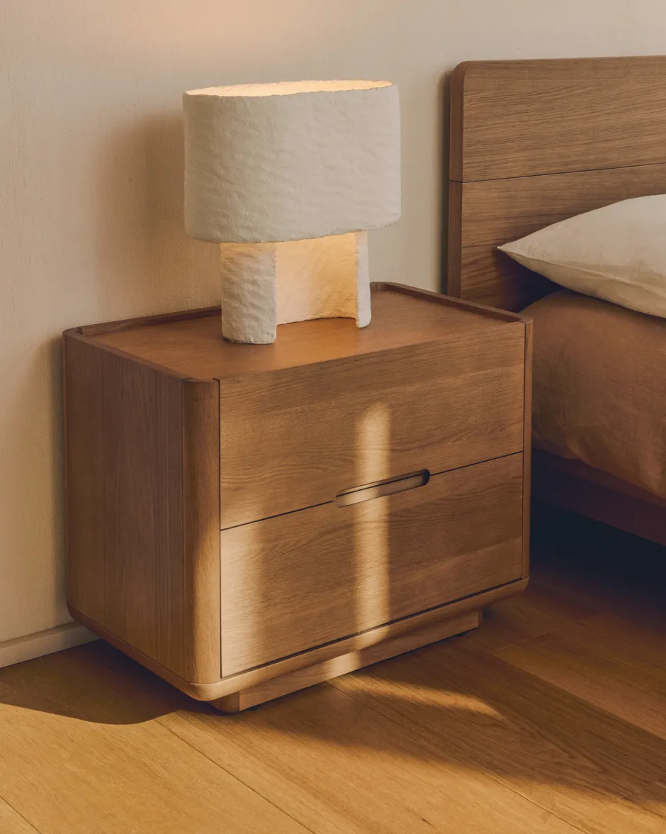 - Nachtkastje van fineer en massief eikenhout met lichtbruine afwerking.