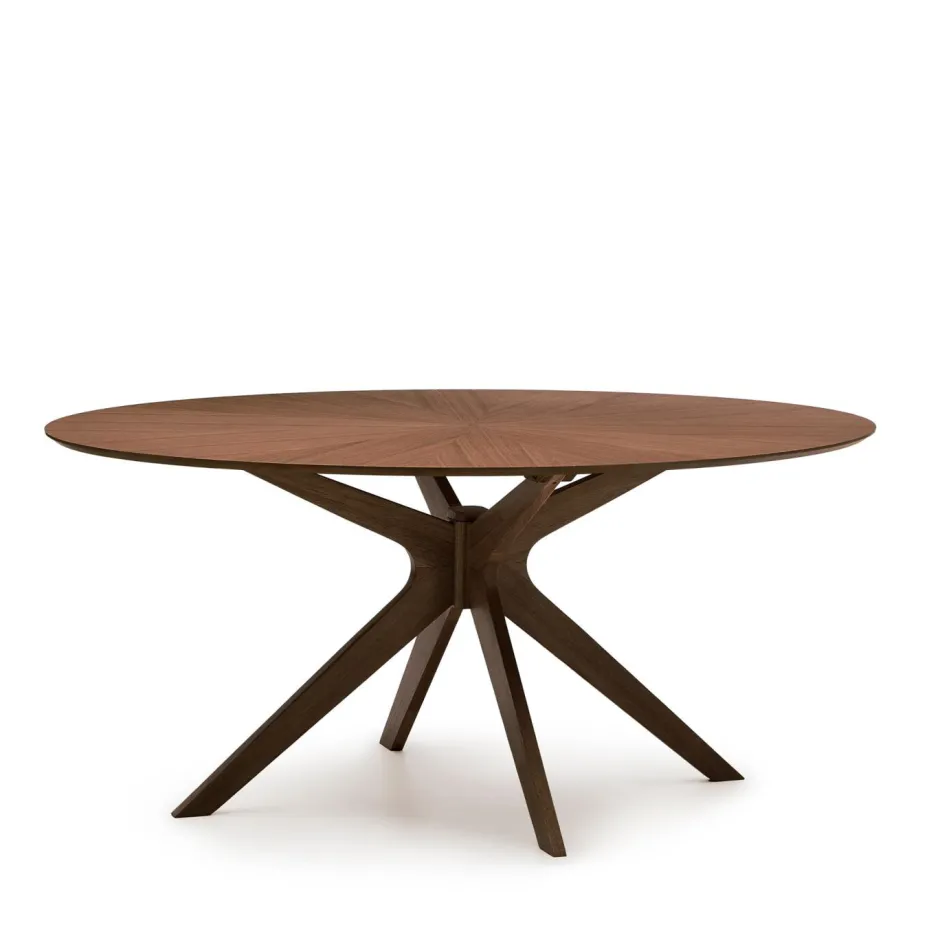 Elke Naanim-tafel is uniek, gemaakt met natuurlijk eikenfineer en massieve rubberhouten poten. Bovendien komen de nerven samen in een stervorm met exclusieve tinten, wat het een onderscheidend karakter geeft.