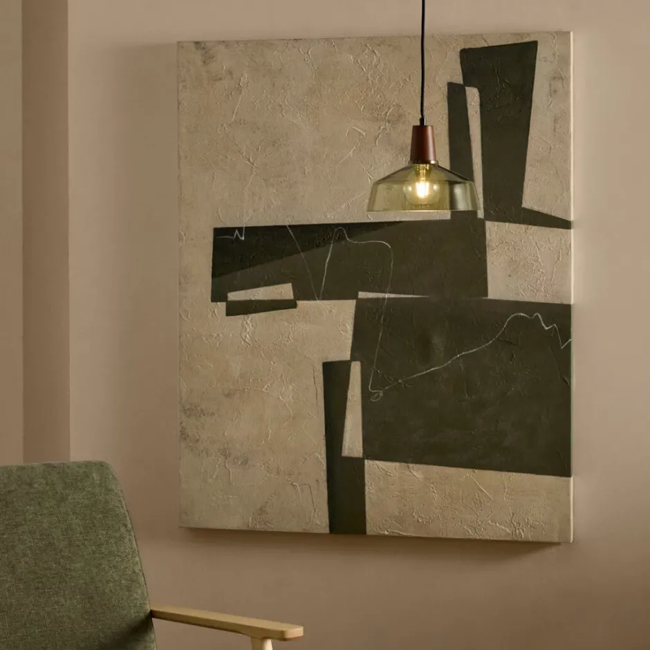 Fida voegt een vleugje kleur toe aan je kamers. Het ontwerp combineert geometrische vlakken gevormd door overlappende organische penseelstreken met een getextureerde achtergrond die een verweerd effect creëert.
