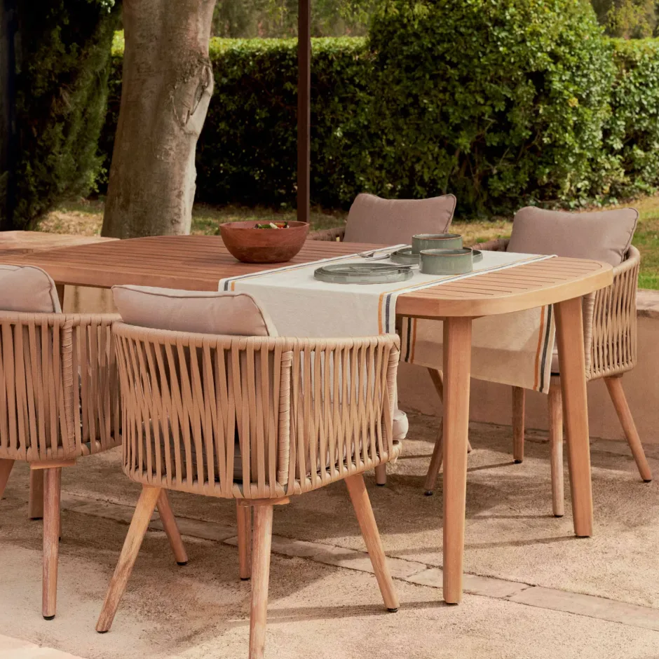 Ronde vormen zijn trendy: creëer uw buiteneetkamer met de Maset-tafel, waar iedereen een plekje heeft om te eten. Veelzijdigheid is zijn sterke punt, gemaakt van massief eucalyptushout, te combineren met allerlei omgevingen en stijlen.