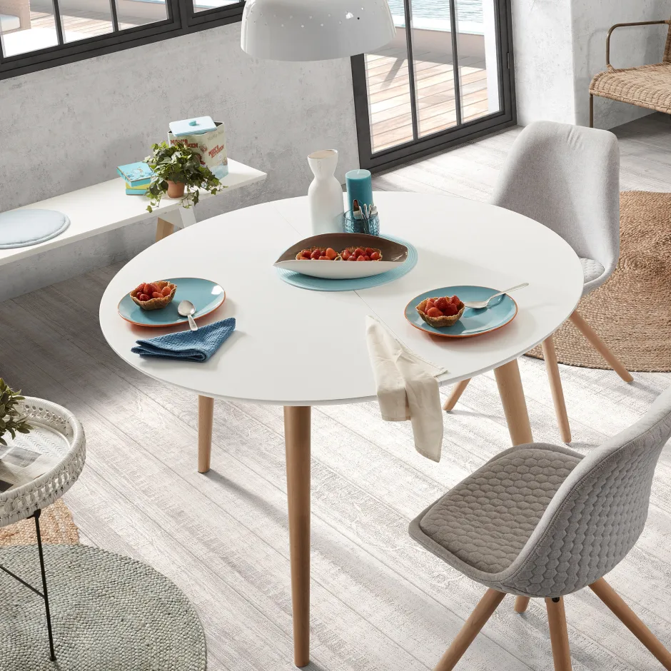 Uitschuifbare tafel rond met DM lak en mat wit. Geverniste beukenhouten poten . Maximale lengte 200 cm. Dit model is inclusief zak om de verlengstukken te bewaren