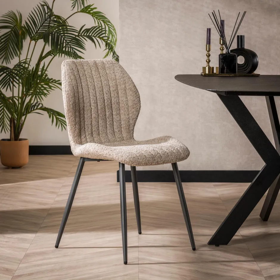 •Trendy eetkamerstoel uitgevoerd in bouclé met metalen frame.