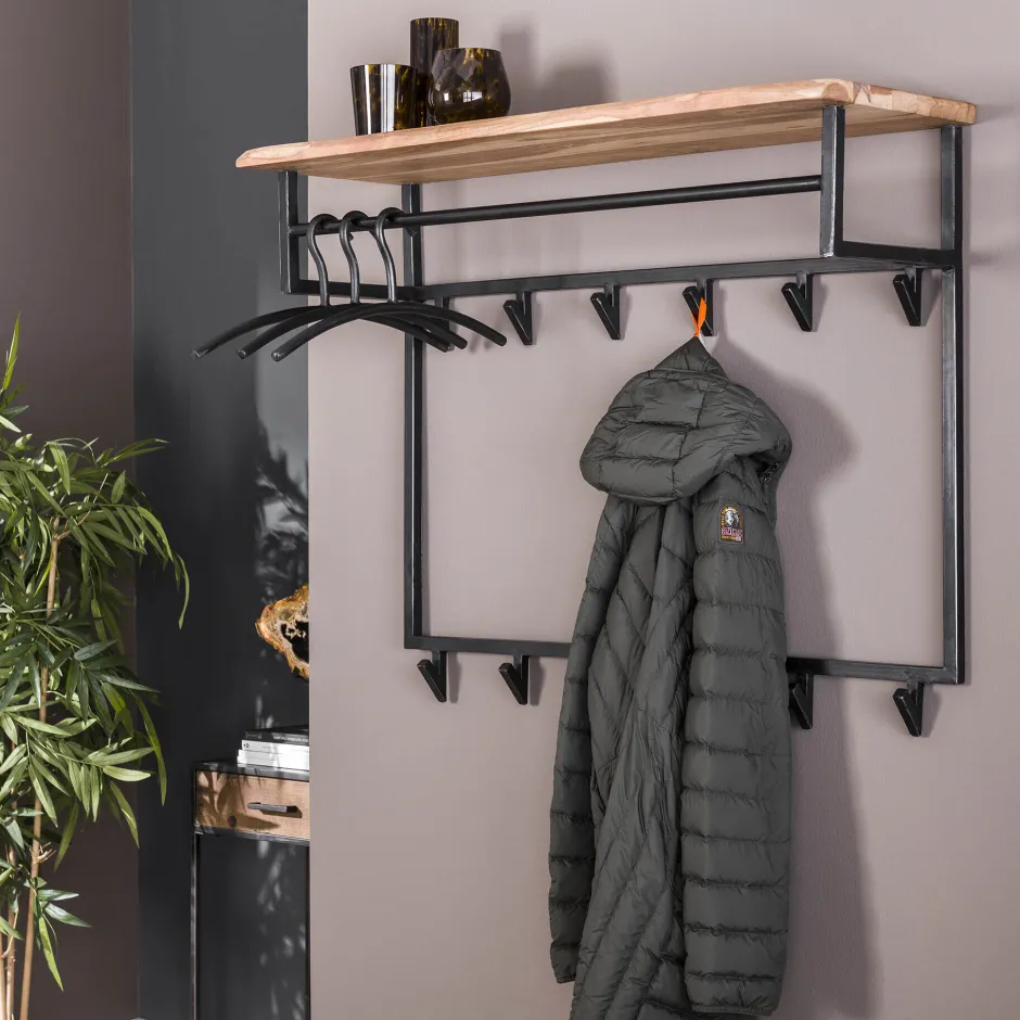 Deze kapstok is voorzien van een hoedenplank gemaakt van massief acacia hout van 25 milimeter dik. Zorgvuldig geselecteerd hout, voorzien van een fijne nerf en diverse noesten, die op ambachtelijke wijze wordt verwerkt. Dit zorgt voor een natuurlijke én unieke look aan de wand. Aan de hoedenplank is een zwart geschuurd metalen roede bevestigd en zijn er 12 haakjes aanwezig. Er kunnen dus zowel jassen aan een haakje als aan een hanger worden opgehangen. De kapstok is voorzien van twee bevestigingsogen aan de achterzijde, zodat de kapstok eenvoudig aan de wand kan worden gemonteerd.
