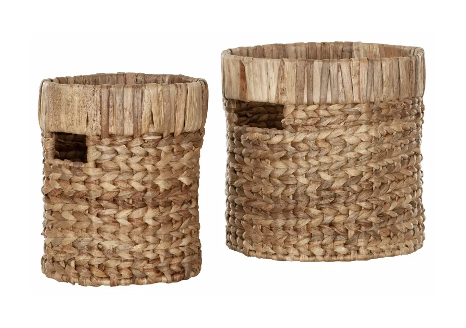 Deze set van 2 opbergboxen is qua grootte ideaal voor in een kast of op je bureau. De boxen zijn gemaakt van waterhyacint, een bijzonder en duurzaam materiaal. Ze hebben een afmeting van 25xØ24 cm en 20xØ26 cm.
