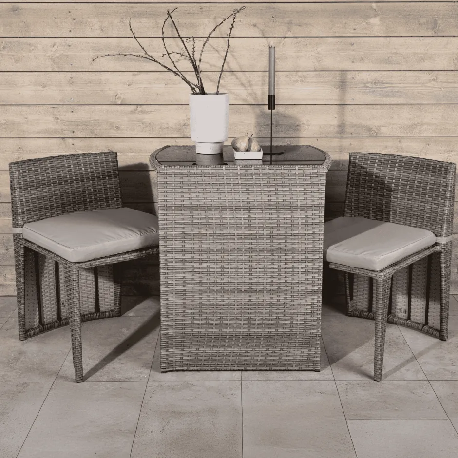 Gezellige zwarte café set in een mooi ontwerp gemaakt van duurzaam kunstrotan dat perfect past op een kleiner terras. De café set bestaat uit twee stoelen en een tafel met bijbehorende glasplaat die bestand is tegen weer en wind, de nette stoelen zijn voorzien van zachte zitkussens en je kunt de stoelen gemakkelijk onder de tafel schuiven om ze gemakkelijk op te bergen en ruimte te besparen.