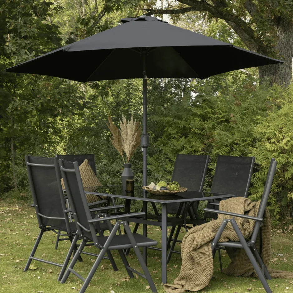 Koel even af in de schaduw in een moderne eetgroep onder een slimme parasol! De Rosemary eetgroep biedt zowel een stijlv…