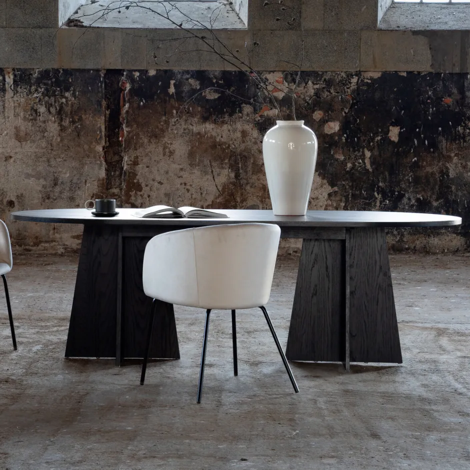 De ovale eettafel ‘Cynthiaann’ is een stijlvolle toevoeging aan ieder interieur. Gemaakt van stevig MDF en afgewerkt met een verfijnde whitewash, straalt deze tafel een moderne en lichte sfeer uit. Het Scandinavische ontwerp wordt gekenmerkt door eenvoud en functionaliteit, met een verfijnde balans tussen vorm en functie.