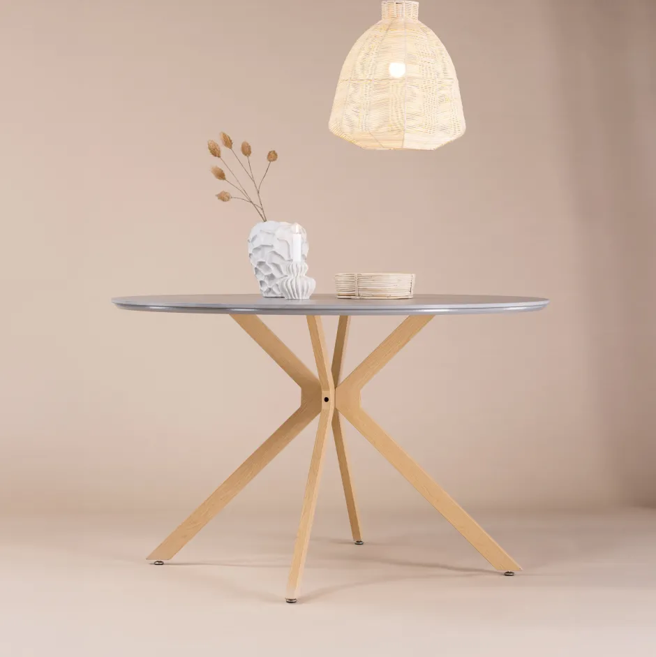 Chenell, onze populaire, ronde eettafel met luxe uitstraling en trendy details in het ontwerp. Het tafelblad is gemaakt van spraystone in een slanke grijze kleur en de romp heeft een decoratieve look met houten kruispoten die een vaste blikvanger vormen. Een designtafel die opvalt in elke kamer en zeker de ogen van je gasten zal trekken. Creëer een mooi middelpunt voor jou en je familie om rond te verzamelen!