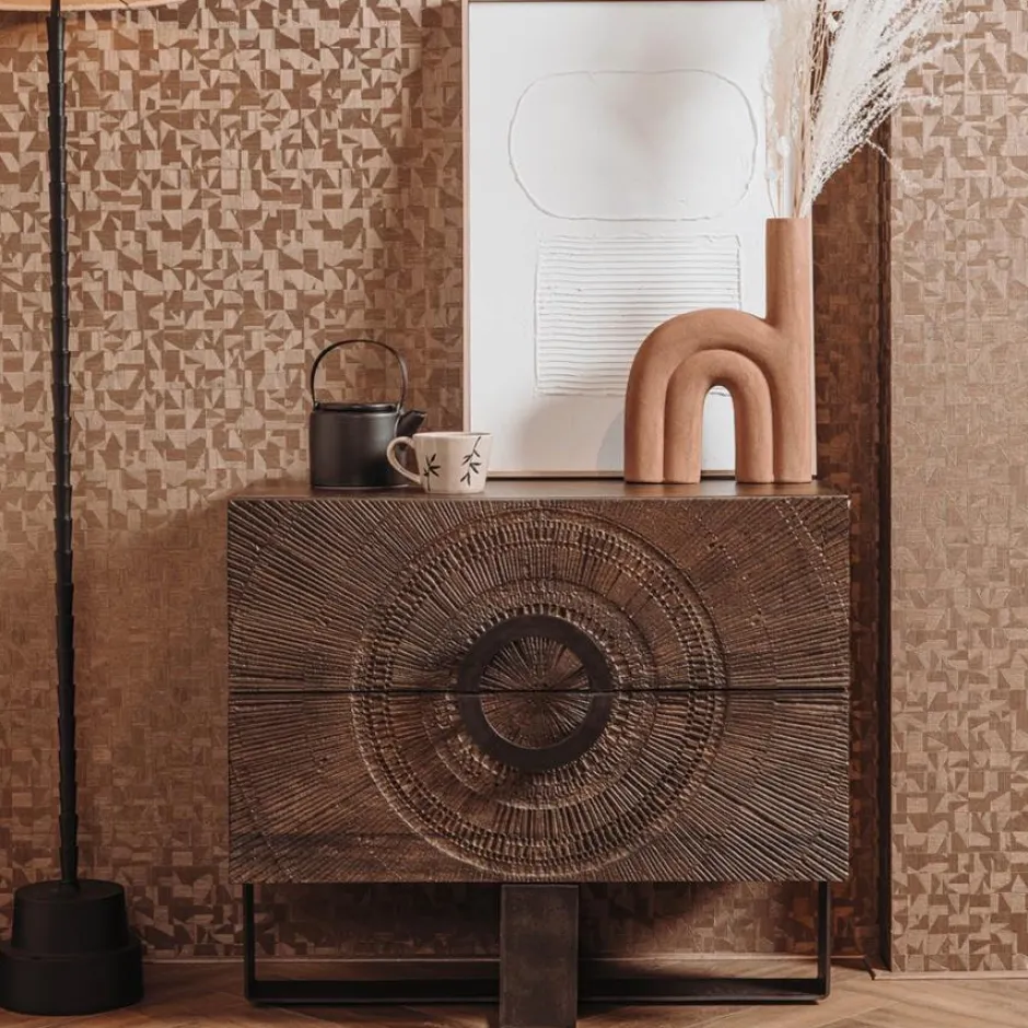 De twee lades zijn voorzien van een rond patroon dat zorgt voor een speelse en decoratieve touch. Dankzij de combinatie van retro invloeden en bohemian details past Padua perfect in interieurs die warmte en eigenheid uitstralen. Een compacte kast met een opvallend ontwerp.