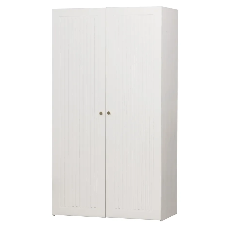 De WOOOD kledingkast Sipke is een stijlvolle kast van wit grenenhout met een frisse en moderne uitstraling. Achter de brede deur met een opvallend latjespatroon en goudkleurige deurknoppen bevindt zich een royale hangruimte met stevige roede, ideaal voor jassen, jurken en overhemden. Bovenin vind je een praktische legplank waar je extra kledingstukken of accessoires kunt opbergen.