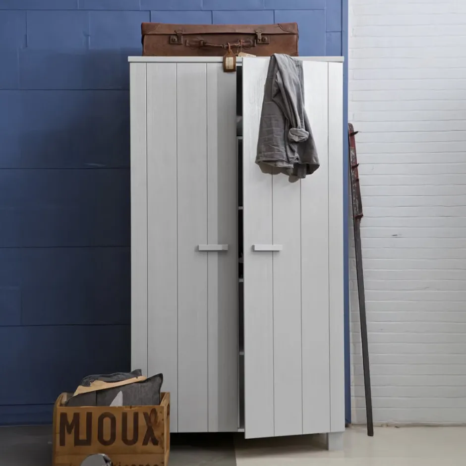 Deze stoere kast komt uit de collectie van WOOOD. Deze robuuste hang/leg kast heeft een geborstelde afwerking en is met een watergedragen verf gespoten. Het interieur van de kast is van melamine en bestaat uit één brede legplank bovenin met daaronder links een gedeelde roede en rechts drie gedeelde legplanken. Door de doorleefde uitstraling van het grenenhout is ieder exemplaar uniek!