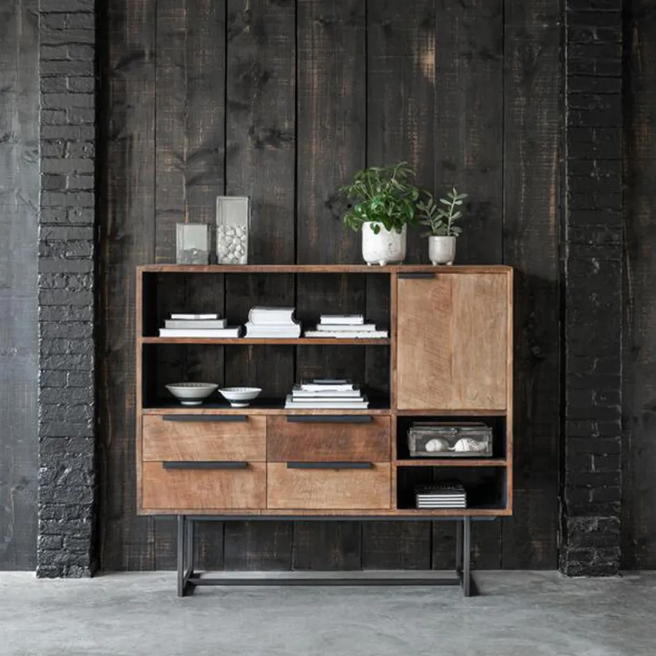 Dressoir Odeon is gemaakt van teakhout en is afgewerkt met een zwart metalen frame. Het dressoir heeft een afmeting van 120x136x40x cm en heeft 1 deur, 4 open vlakken en 4 lades.