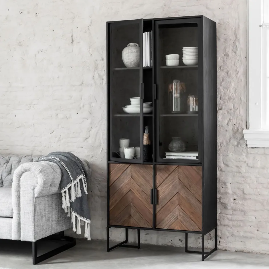 Als je op zoek bent naar bijzondere meubels, dan is onze Criss Cross collectie iets voor jou. Deze vitrinekast is gemaakt van een combinatie tussen gemixt hout en staal en valt op dankzij het visgraatpatroon. Vitrinekast Criss Cross beschikt over 2 glazen deurtjes en 2 metalen deurtjes en heeft een afmeting van 185x80x40 cm.