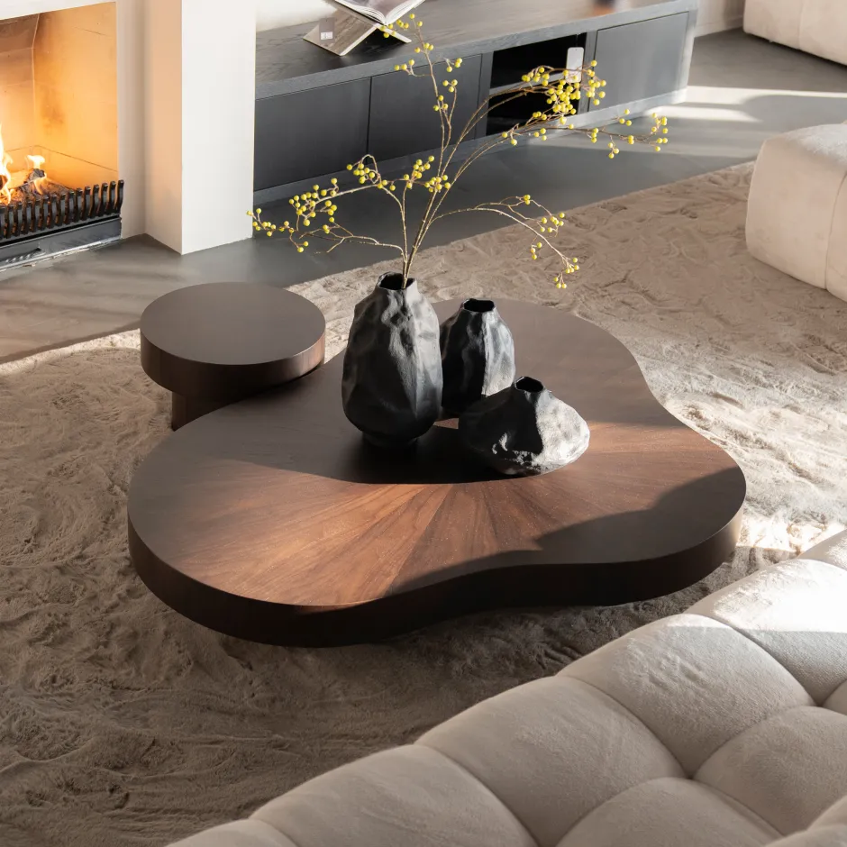 Voeg natuurlijke warmte toe aan je interieur met deze salontafelset in walnoot-fineer. De twee organisch gevormde tafels vullen elkaar perfect aan en brengen een speels en stijlvol karakter in je zithoek. De zachte contouren zorgen voor een zachte vloei in de ruimte terwijl het rijke hout een uitnodigende sfeer creëert. Dankzij het tijdloze ontwerp passen de tafels moeiteloos in diverse woonstijlen en vormen zij een subtiele blikvanger in je zithoek. Combineer ze met een lichte bank en een vloerkleed in aardtinten om de natuurlijke uitstraling extra te versterken.