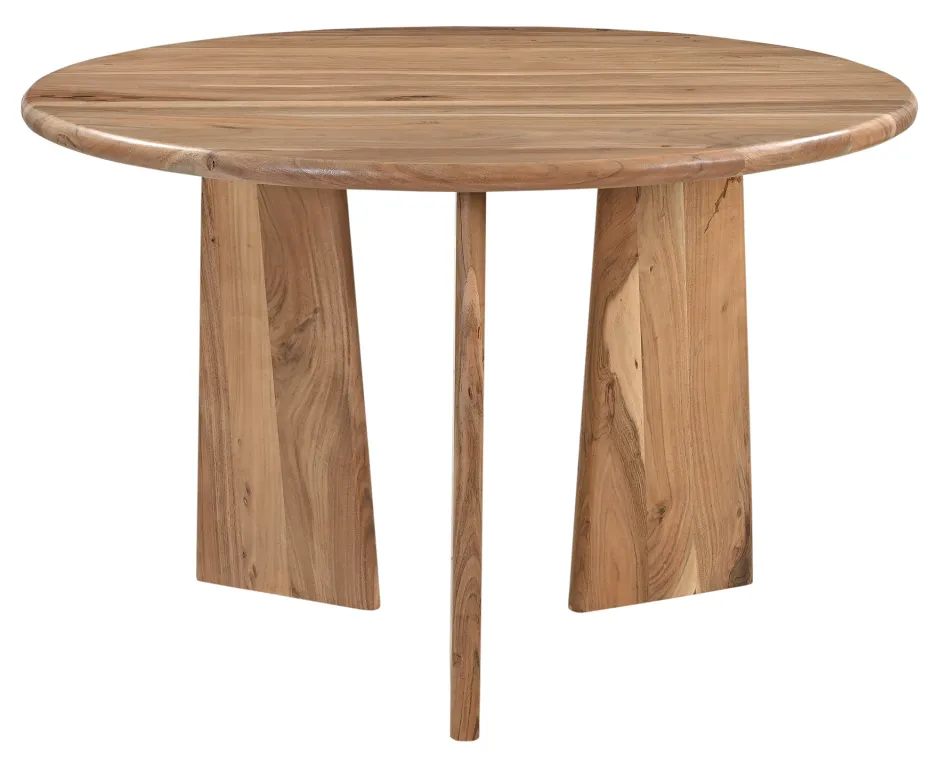 Deze tafel van massief acaciahout combineert natuurlijke elegantie met een moderne, creatieve ontwerpbenadering. Met zijn afgeronde hoeken en asymmetrische frame is hij niet alleen functioneel, maar ook een echt designstatement in elke kamer. Het natuurlijk gekleurde acaciahout brengt de schoonheid van de natuur direct in huis met zijn warme tinten en levendige nerf. Het handgemaakte oppervlak laat de individuele structuur van het hout tot zijn recht komen en maakt elk stuk uniek. De afgeronde randen van de tafel zorgen voor een zachte, vloeiende uitstraling waardoor hij bijzonder harmonieus oogt. Tegelijkertijd verhogen ze het comfort door harde lijnen en scherpe randen te vermijden – ideaal voor een vriendelijke en uitnodigende sfeer. Het opvallende kenmerk van de tafel is echter het asymmetrische frame, dat hem een moderne en licht avant-gardistische touch geeft. In plaats van een klassiek, symmetrisch onderstel verrast deze tafel met een dynamisch ontwerp dat de look visueel losser maakt en tegelijkertijd voor stabiliteit zorgt. Met zijn compacte afmetingen van 120×120 cm is de tafel ideaal voor kleinere eetruimtes of als gezellig ontmoetingspunt in de keuken. Hij biedt genoeg ruimte voor gezamenlijke maaltijden, creatief werk of sociale bijeenkomsten zonder de ruimte te domineren.