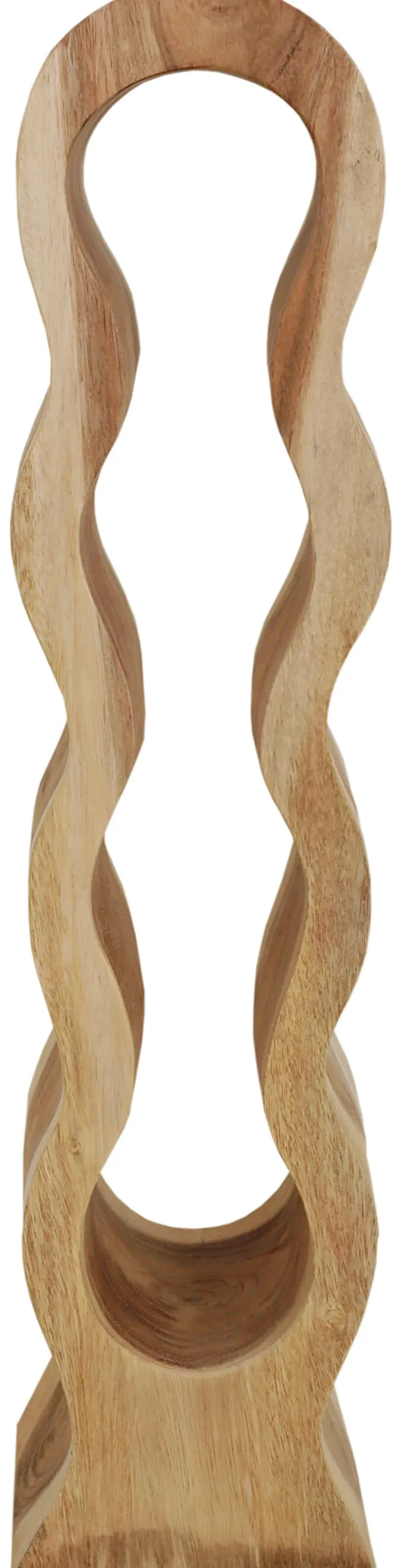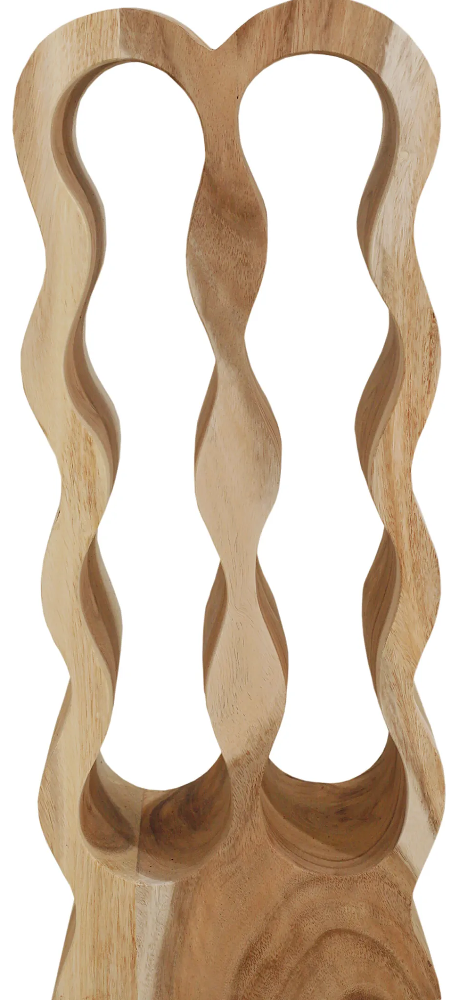 Het wijnrek van hoogwaardig Suar-hout is een perfecte oplossing om je mooie wijnen stijlvol en compact op te bergen. Met ruimte voor maximaal 4 flessen is dit rek een handige manier om je wijnen netjes en veilig te bewaren. Het bijzondere aan dit wijnrek is het Suar-hout, dat bekend staat om zijn duurzame kwaliteit en unieke nerf. Elke fles wordt stevig vastgehouden door de golfvormige steunen en tegelijkertijd mooi gepresenteerd. De zachte golfvormen van het rek passen mooi in de kamer en zorgen voor een fijne sfeer. Het natuurlijke hout geeft een warme, organische uitstraling die perfect past bij verschillende interieurstijlen. Met zijn zorgvuldige afwerking en aantrekkelijke ontwerp is het rek niet alleen stevig, maar ook een echte blikvanger. Het benadrukt de natuurlijke charme van het hout en laat je wijnflessen in stijl zien. Of het nu in de woonkamer, eetkamer of op het aanrecht is – dit wijnrek zorgt ervoor dat je favoriete wijnen perfect worden gepresenteerd en is tegelijkertijd een decoratief statement in je huis. Voor wijnliefhebbers die functionaliteit en esthetiek willen combineren in een compact meubelstuk, is dit wijnrek de ideale keuze. De golvende structuur en natuurlijke schoonheid van Suar-hout maken het een uniek hoogtepunt dat je wijncollectie laat zien en een vleugje luxe aan je kamer toevoegt.