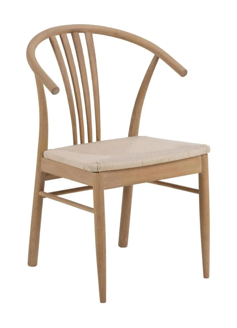 Deze eetkamerstoel draait helemaal om klassiek Scandinavisch design. De traditionele uitstraling wordt bereikt door de combinatie van strakke lijnen en natuurlijke materialen. De gevlochten zitting is gemaakt van papieren touw, terwijl het frame is gemaakt van eikenhout behandeld met wit gepigmenteerde olie.