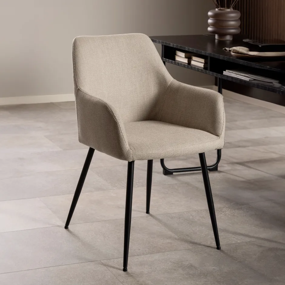Deze klassieke stoel met armleuningen wordt gekenmerkt door tijdloze elegantie en is bekleed met een beige stof met een tweekleurig effect. Dit geeft het ontwerp een mooie, gestructureerde uitstraling. Aangevuld met slanke zwarte stalen poten heeft de stoel een veelzijdige uitstraling die past bij verschillende eetkamerstijlen.