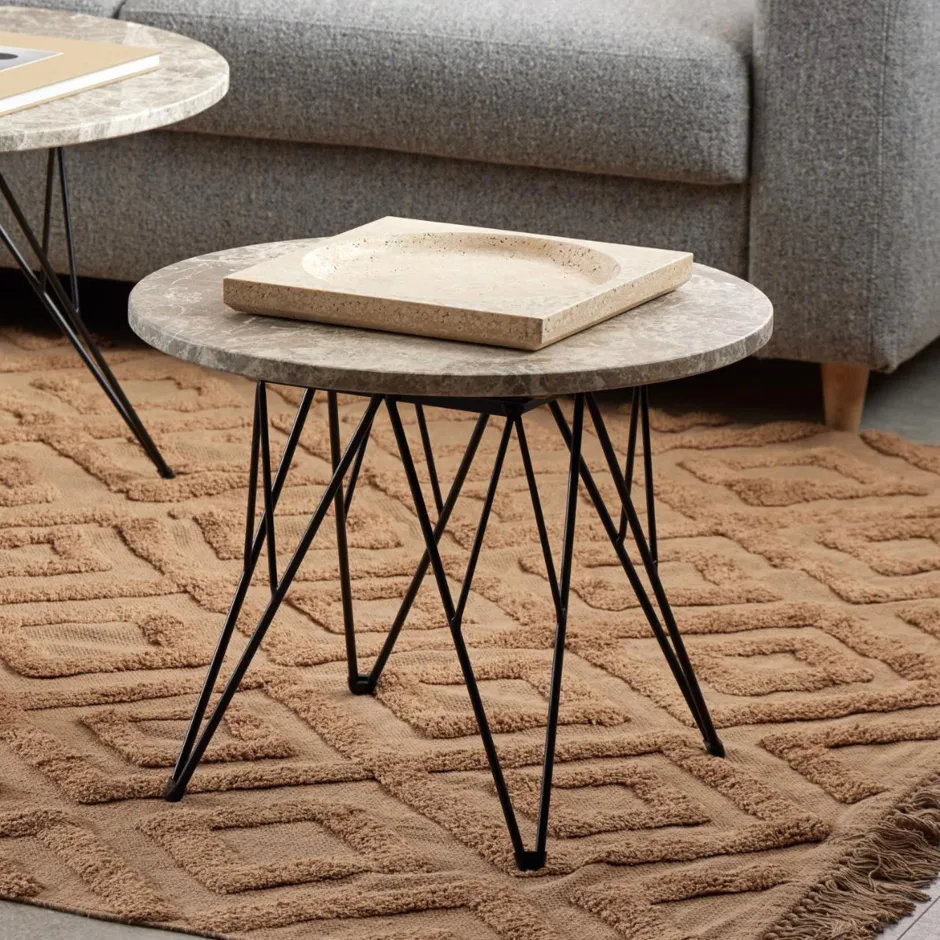 Deze bijzettafel zal zowel minimalisten als maximalisten aanspreken. Het heeft een visueel opvallend blad van grijsbruin marmer, ondersteund door een onderstel van zwart draad. Het evenwichtige contrast tussen de verhoudingen geeft het ontwerp een luchtige charme. Het past gemakkelijk bij allerlei interieurstijlen.