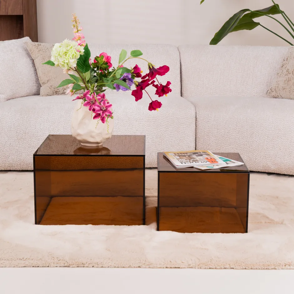 Deze vierkante salontafelset is volledig gemaakt van bruin gehard glas en zal de woonruimte opwarmen. De set bestaat uit twee vierkante tafels in twee maten, die verschillende stylingopstellingen en doeleinden bieden. Of ze nu op zichzelf staan of samen, ze brengen een gelaagde, lichte look in elke ruimte.