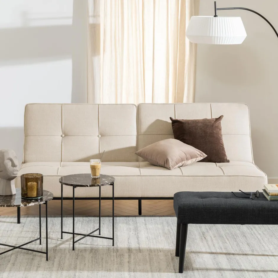 Gestoffeerd in een beige stof met tweekleurig effect en met vierkante stiksels maakt deze stijlvolle slaapbank veel indruk. Het split-back ontwerp en het click-clack systeem maken hem ideaal voor multifunctionele kamers. De veelzijdige slaapbank biedt 3 verschillende standen en kan in een fractie van een seconde worden omgebouwd van ligstoel tot bed voor overnachtende gasten.